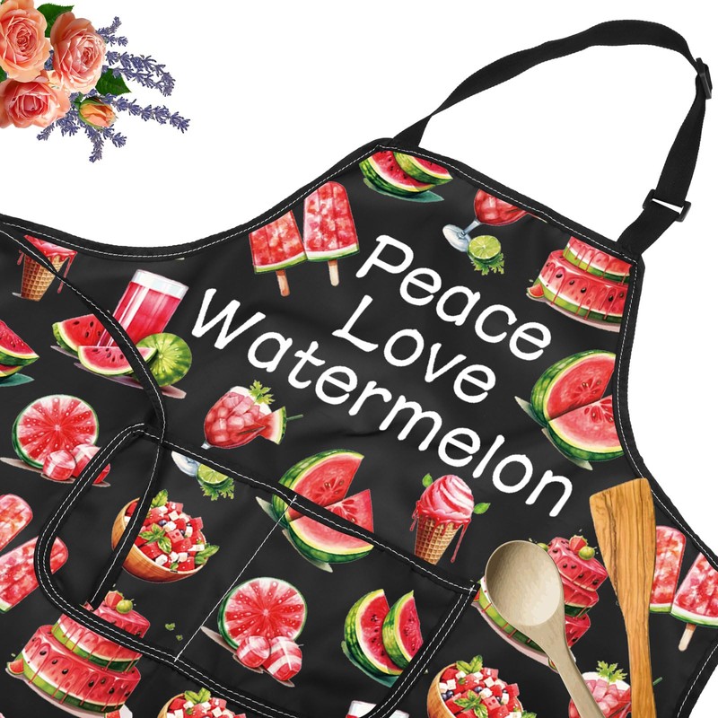 JXGZSO Küchenschürze mit Wassermelonen-Motiv, Peace-Love, Wassermelonenschürze mit Taschen, Wassermelonen-Motiv, Party-Geschenk für Obstliebhaber, Peace Love Wassermelone, Groß