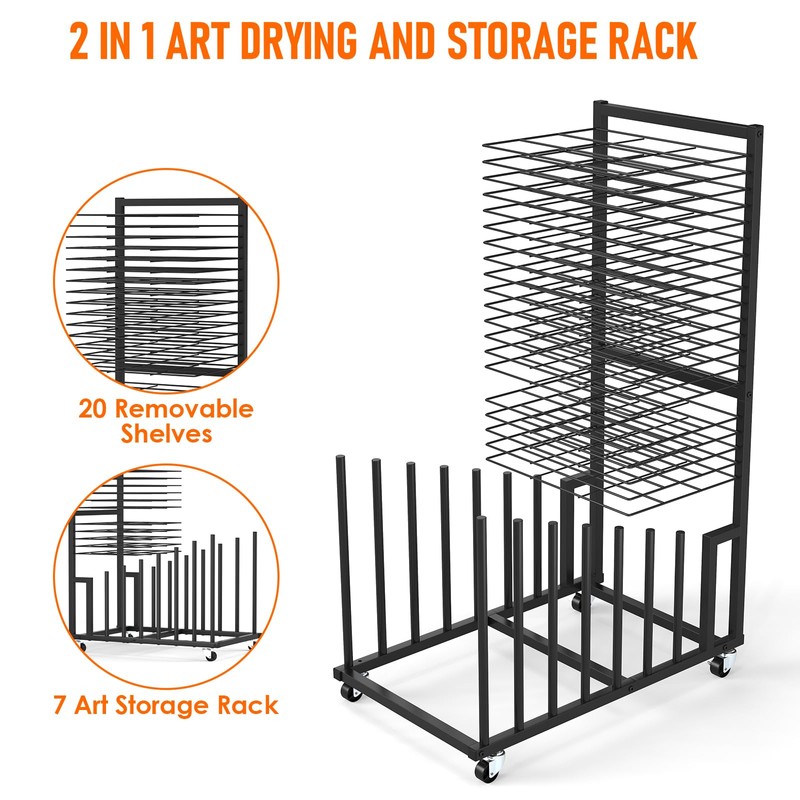 - 2 in 1 Art Storage Rack: The art drying rack comes with 20 removable shelves, 1" apart on each tier, to ensure your artwork is stored and dried in a compact, organized manner, with plenty of room for your storage needs. Each shelf can hold up to 3 pounds, so you don't have to worry about dropping your painting