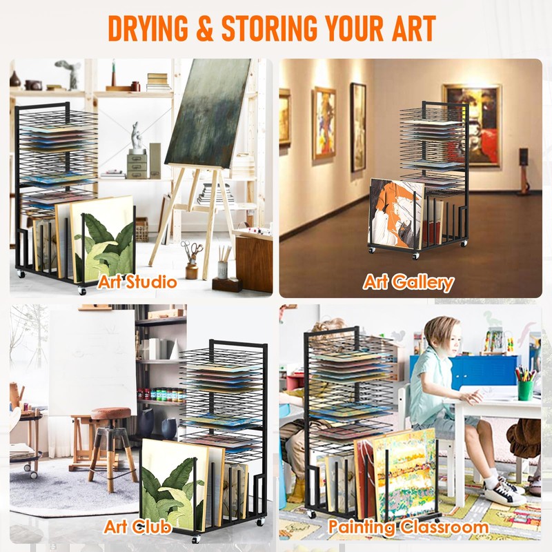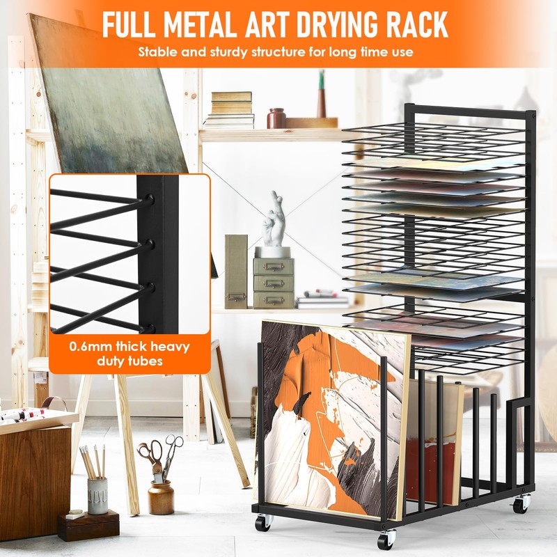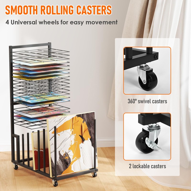 - Art Drying Rack with Wheels: Our art display rack has 4 heavy-duty universal wheels, 2 of which are lockable. You can move it smoothly on carpet, tile, or wood floors and keep it securely in place wherever you need it. The package comes with all necessary hardware and easy-to-follow instructions for easy installation