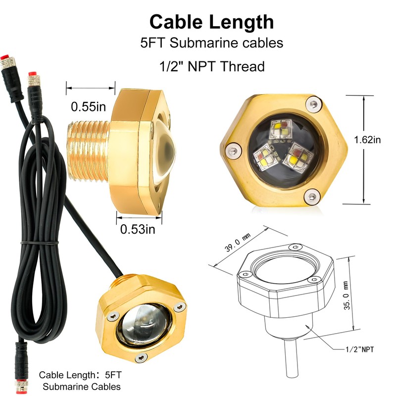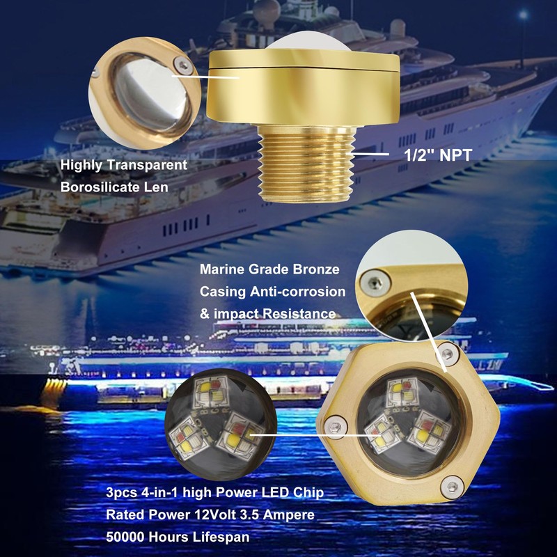 - Premium Waterproof & Durable Design:IP68-certified waterproof/dustproof rating for prolonged submersion; marine-grade bronze housing resists corrosion and withstands harsh saline environments.Stainless steel waterproof quick-connect interfaces + sealed protective cable sheathing provide dual-circuit protection, extending lifespan to 50,000 hours.