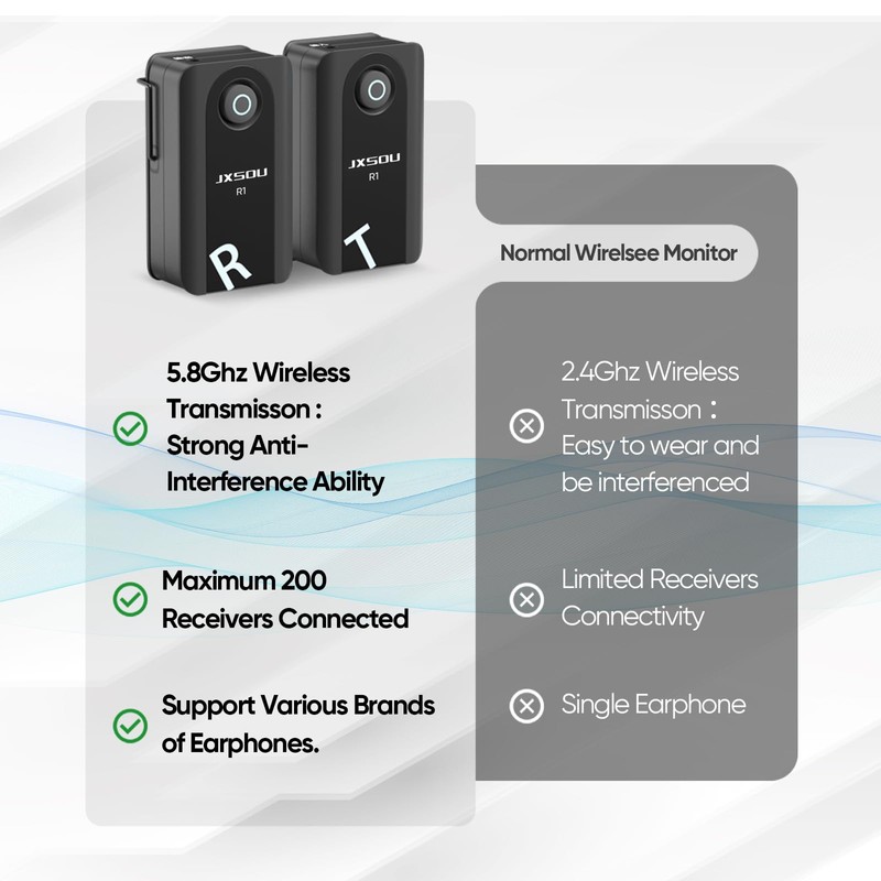 - 【Plug and Play】JXSOU R1 Wireless in-Ear Monitor System comes pre-paired and is ready to use right out of the box. The wireless transmitter and receiver are automatically matched by default, providing hassle-free connectivity.