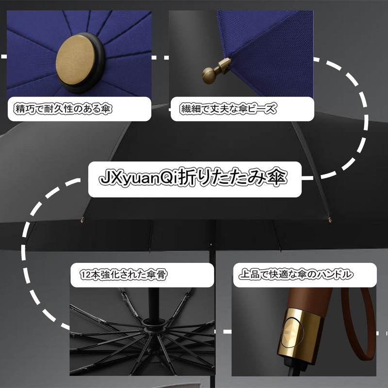 JXyuanQi 12 Ribs, Full Light Blocking, Folding Umbrella, One-Touch Automatic Open/Close, Parasol, For Both Sun and Rain, 100% UV Protection, Premium Brushed Bronze Wooden Handle, Lightweight, Compact