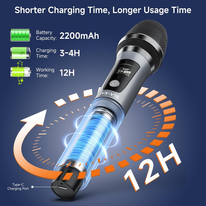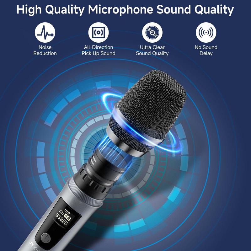 JYX Micrófono Inalámbrico, Micrófono Dinámico para Karaoke con Receptor y Anillo Antideslizante, Distancia de Transmisión de 80ft, Sistema de Micrófono Recargable para Noche de Karaoke, Reunión