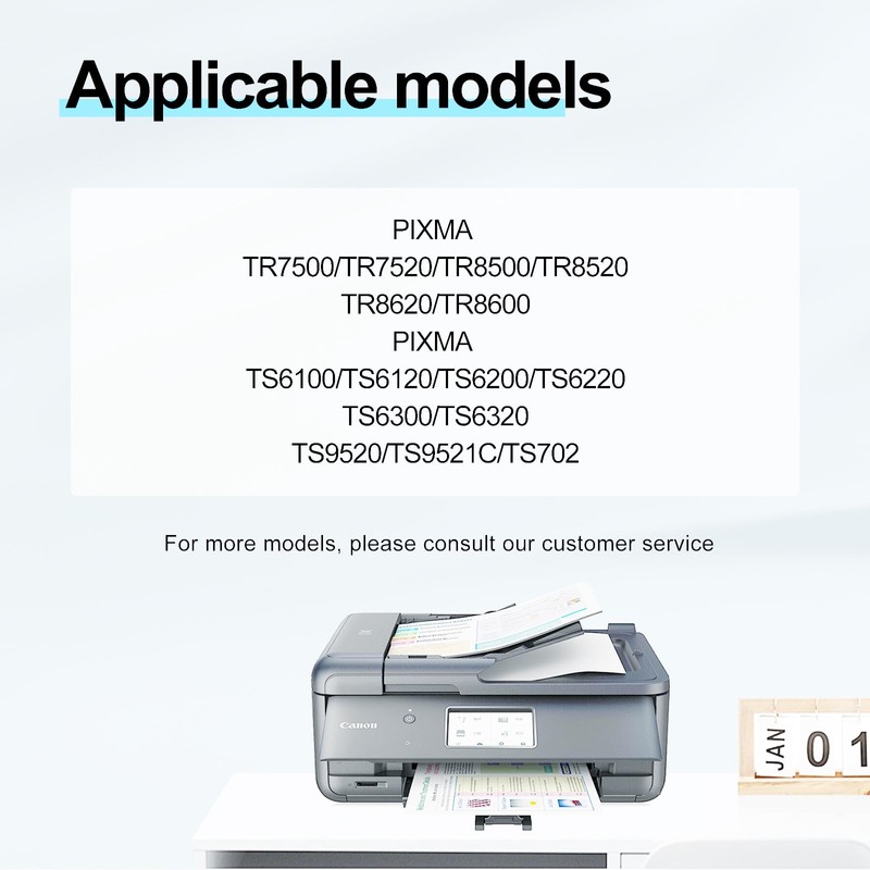 - Fit for Printers: Compatible for Canon for Pixma TR7520, TR7500, TR7620, for Pixma TR8520, TR8500, TR8620, TR8622, for Pixma TS6100, TS6120, TS6200, TS6220, TS6300, TS6320,TS9520, TS9521C, TS702, for Pixma TS8120, TS8100, for Pixma TS8220, TS8200, TS8322, TS8222, TS8320, TS8300, TS9120, TS9100 Inkjet Printer