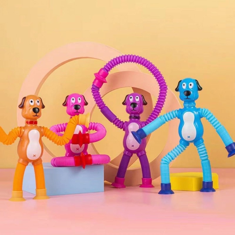 - The legs and arms of the little toy dog are pop tube type, which are retractable and making sound at the same time. The noise they make cause the children to smile and even giggle. The limbs can be stretched and deformed at will to explore different ways to play. And the suction cups at the end allows it to attach to smooth surface, such as tiles, glass, mirror, ceramic, metal ).