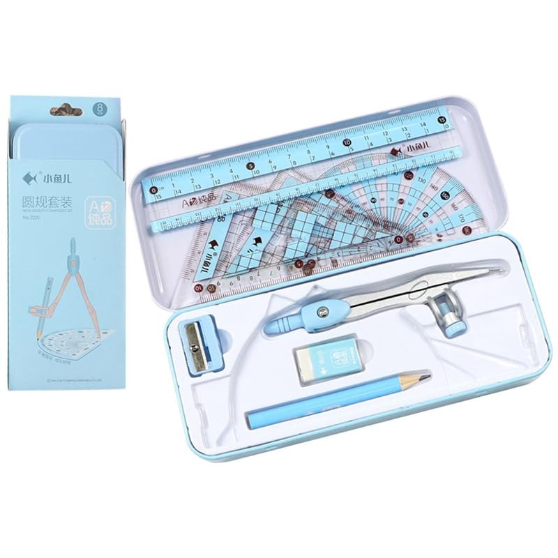JZS Compass Geometry Tool Protractor 8 PCS and Compass Set with Metal Box Includes Ruler, Protractor