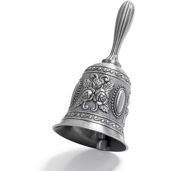 - Elegant & Durable: This silver hand bell is not just any bell. It is crafted from high-quality zinc alloy and features an exquisite rose engraved pattern, giving it a vintage and elegant appearance. It is perfect for weddings, classrooms, churches, holidays, dinner tables, and anywhere else that requires attention-getting ringing.Size: height 13.4cm, diameter 5.4cm.