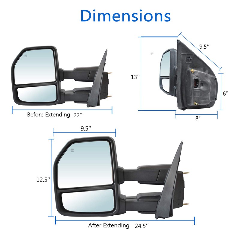 • SPECIFICS: Power/ Heated/ Turn Signal / Puddle Lights/ Auxiliary Lights/ Temperature Sensor/ Manual Extendable Arms/ Chrome Cap/( Both 8 Pin Plug and 22 Pin Plug are applicable)