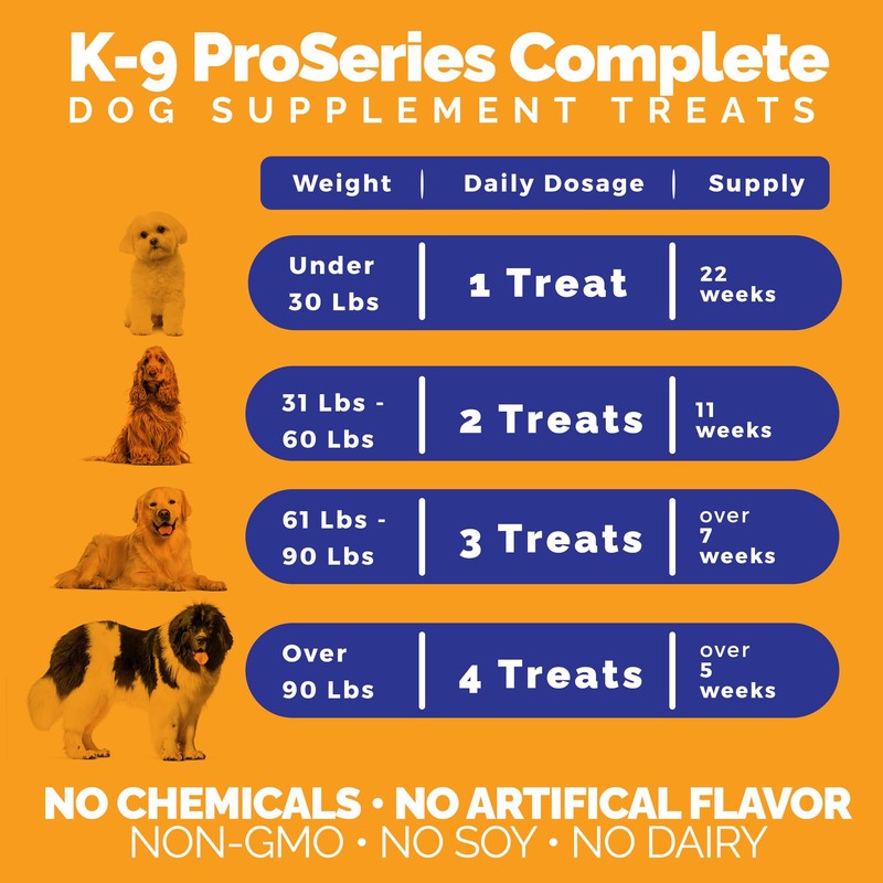 Unleash the power of probiotics for your furry friend with K-9 ProSeries Complete Dog Supplement Treats. This comprehensive formula is packed with essential vitamins and minerals to support your canine companion at any age. Crafted with care in the USA, these treats promote a healthy gut, strengthen the immune system, alleviate joint pain, improve mobility, and nourish a radiant skin and coat. These tasty morsels are packed with 6 dog-specific probiotic strains that work wonders for your pup's overall health. Promote a healthy gut and reduce gastrointestinal issues while supporting their immune system and reducing allergic reactions. These treats enhance nutrient absorption and help eliminate toxins from the body. Not only do they support skin and coat health, but they also aid in managing anxiety and stress-related behaviors. Great for addressing allergies, bad breath, skin and coat issues, diarrhea, immune disorders, intestinal inflammation, irritable bowel syndrome, liver disease, obesity, skin disorders, and urinary tract infections. With powerful active ingredients, these treats are a game-changer for your canine companion's well-being.