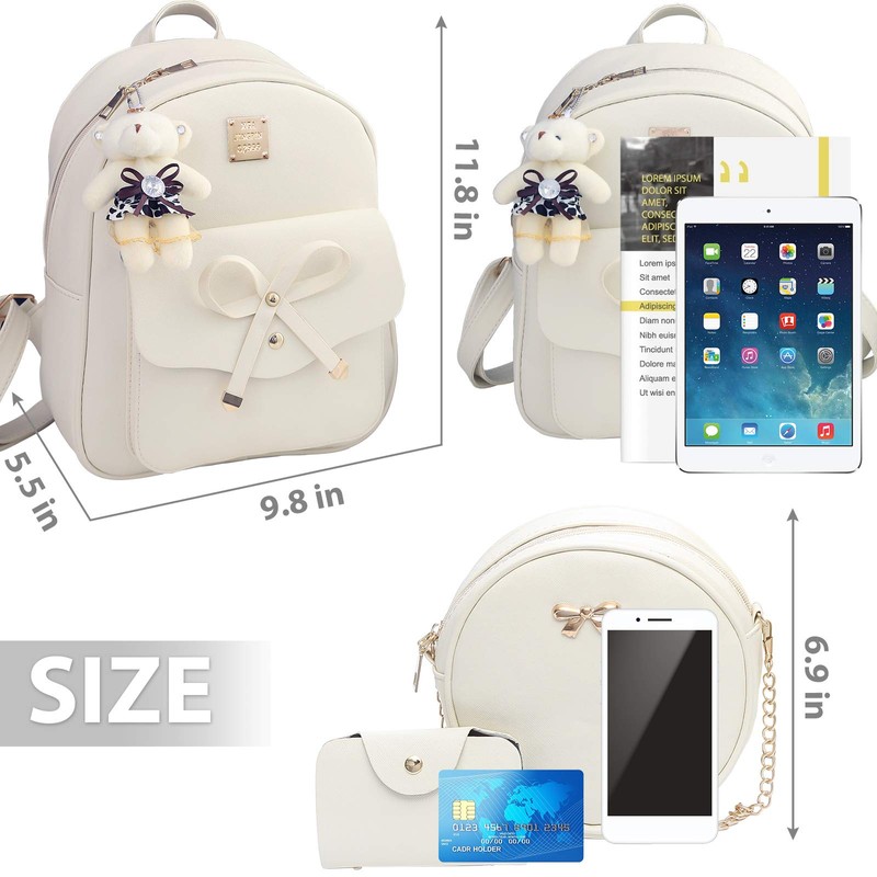 - ❤Structure & Size: Cute leather backpack contains 1 main compartment, 1 front button pocket, 1 zipper back pocket, 2 interior pocket, 1 interior zipper pocket and with adjustable shoulder straps. Cute leather backpack 9.8''L*5.5''W*11.8H'', Mini shoulder bag 6.9''L*1.9''W*6.9''H, Card wallet 3.1''L*0.59''W*4.5H''. Teen girl gifts, girl christmas gifts.