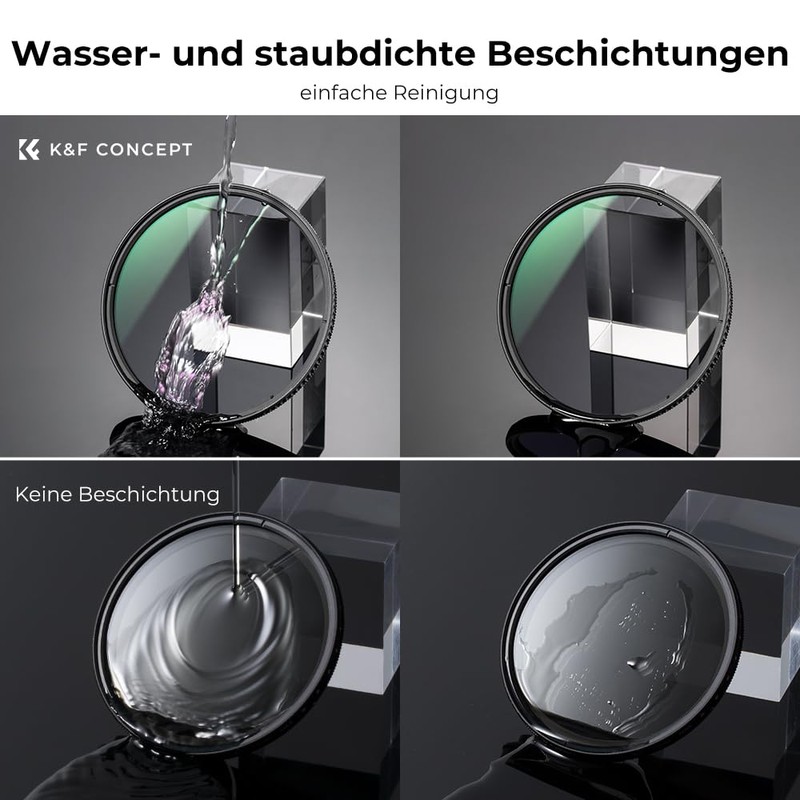 - Reduce reflections: K&F Concept Nano-X CPL reduces 99.9% of polarised light, e.g. water, windows or paint and increases colour saturation and contrast and ensures superior sharpness. Free cleaning cloth x3, cleaning cloth made of imported optical microfibre, soft and lint-free, with strong dirt absorption, which ensures that lenses/filters and other coatings of optical instruments are not damaged, no dust loss.