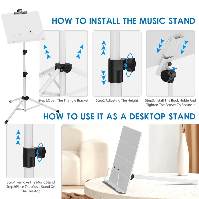 - UNIQUE DESIGN 2 IN 1 DUAL USE - Simply rotate the nut to pull out. Can be used as either floor music stand with tripod stand or desktop sheet music books stand. Gives you two styles on the purpose.