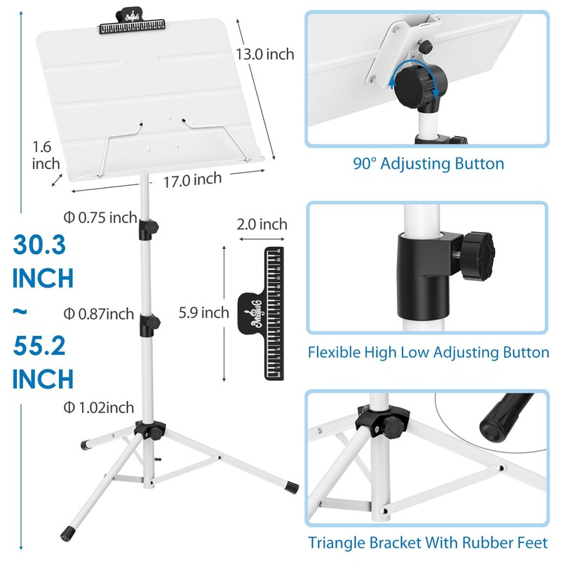 - Satisfaction - Sleek appearance design. Includes 1 x Music Stand; 1 x carrying bag; 1 x Sheet Music Folder; 1 x Music Sheet Clip Holder. Suitable for school, orchestras, choirs, church band and more! Our music stand comes with a 1-year warranty and timely customer service. Please don't hesitate to get in touch with us if you need.