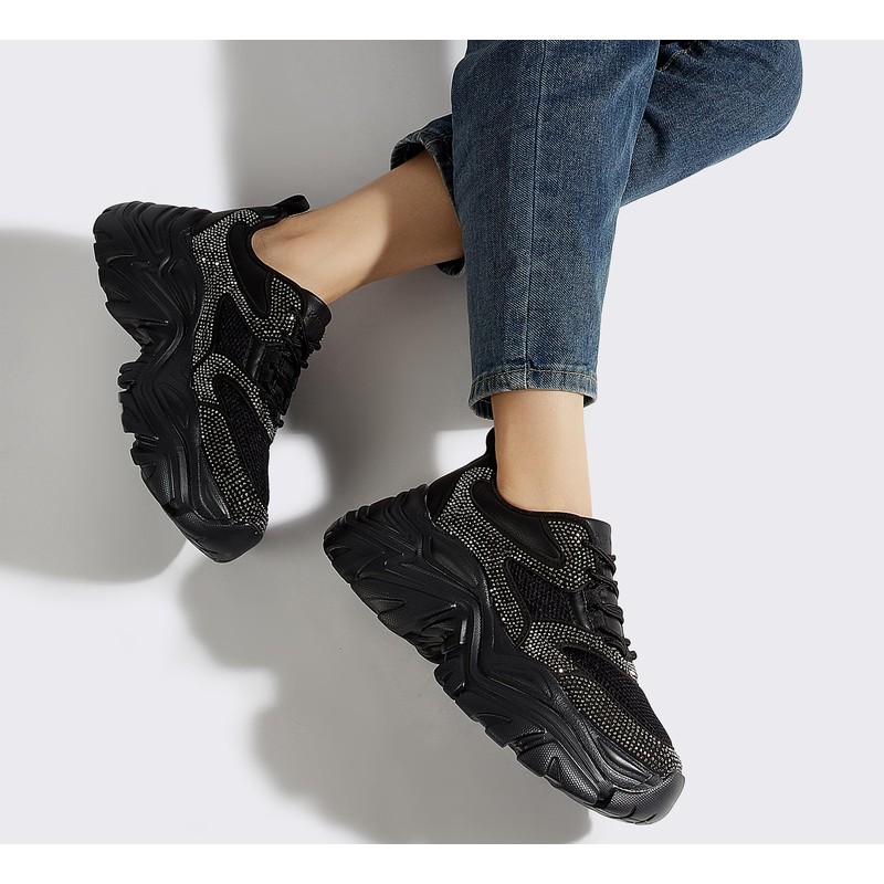 K KIP WOK Chunky Sneakers for Women Fashion Platform Rhinestone White Leather Casual Dad Shoes Comfortable Wedge Walking Sport Sneakers(Black Rhinestone,8.5)