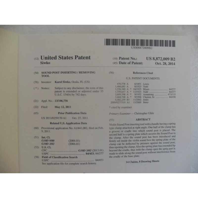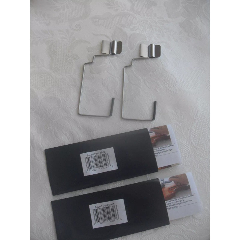 At last a violin sound post setter tools that is user friendly. This patent tools holds the sound post securely in a cradle of the tool until it is ready to be set in new position. The holding clamp is made of very thin metal thus it makes it easy to insert the sound post through the f-hole. Because of unique design the tool can be used to grab the sound post and set it in a new location. The cradle of the tool is offset and unique shape of handle stem allows dual reach so the tool can be used for setting the sound post in a smaller size violin as well as in viola. Unique handle design allows easy control, the tool handle end is formed to point to the sound post in tool cradle. Special Feature of this design is that the retaining spring holding sound post in the cradle is preset thus helping to set the post placement more accurately.
