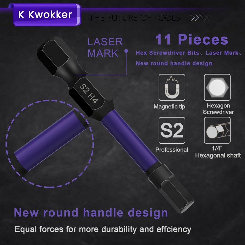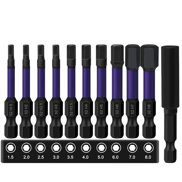 K Kwokker 11pcs 50mm Hex Allen Key Bit Set, S2 Steel Metric Hex Head Allen Wrench Drill, 1.5MM-8MM 1/4" Hex Shank Magnetic Inner Hexagon Screwdriver Bit with 60MM Long Magnetic Bit Holder