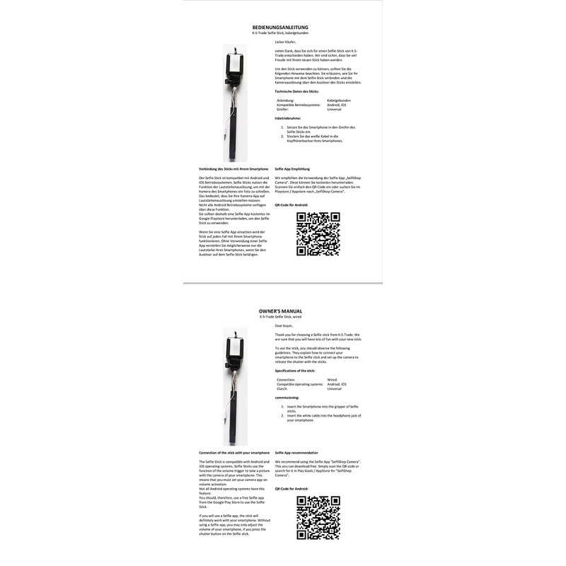 - PRACTICAL & IN: Selfie sticks are simply "in". Now it's easy to shoot photos of yourself and your friends. Whether partying, concerts or sporting events or even while jogging, with a Selfie Stick you will always succeed in getting good pictures.- COMPATIBLE: The Selfie Stick is compatible with Android and iOS operating systems. When the shutter button is not working with the default photo app, simply download a free app. We recommend: "SelfiShop Camera"