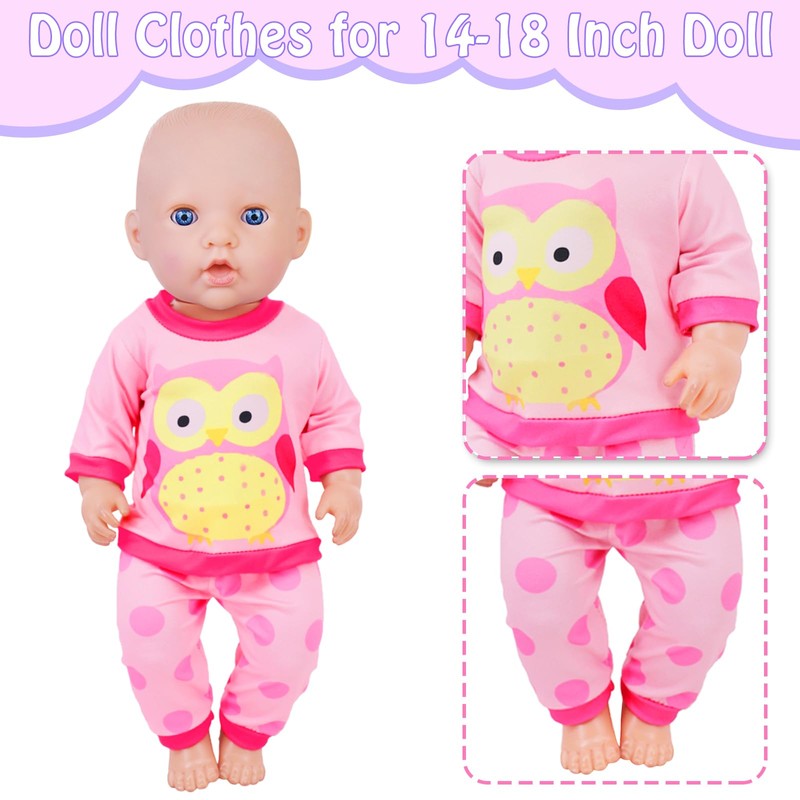 - Packaging includes: 5 sets of different styles of doll clothes and is suitable for 14-18 inch dolls. These five doll pajamas come in various patterns, including a pink sleeping kitten, a blue dancing mermaid, a pink big eyed owl, a light purple smiling bunny, and the popular donut panda(please note that dolls are not included)