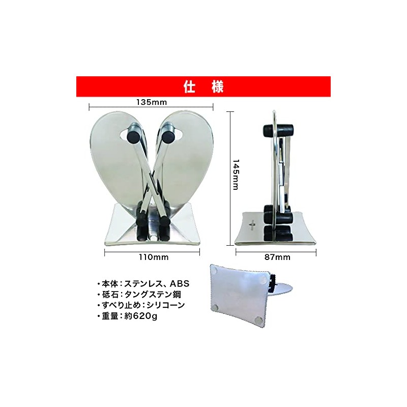 - ■Product Specifications ■ Size (approx.) Width 4.3 x Depth 3.3 x Height 5.6 inches (110 x 85 x 142 mm); Weight: 22.2 oz (620 g); Material: Body: Stainless steel, ABS resin; Whetstone: Tungsten steel, Anti-slip: Silicone; Country of Origin: China
