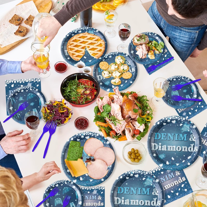 K1tpde Denim and Diamonds Party Tableware - 96PCS Denim Theme Jacket Jeans Tableware Set Included Paper Plates Napkins and Forks, Crystal Birthday Party Supplies for Bachelorette Wedding Decor, 24 Set