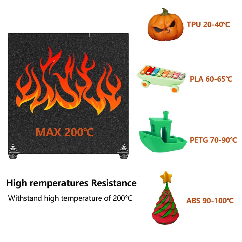 - High Temperature Resistance: withstand high temperature of 200°C (TPU 20-40℃, PLA 60-65℃, PETG 70-90℃, ABS 90-100℃)