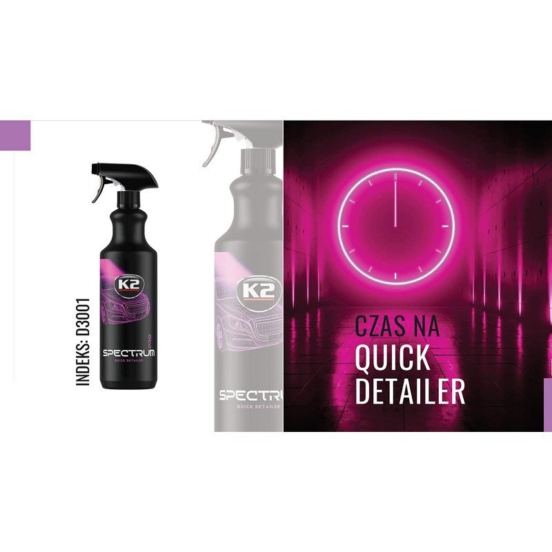 - K2 SPECTRUM PRO is the shining hero based on synthetic wax. A quick detailer designed for quickly refreshing and enhancing the paint and other surfaces. Plastics, rubber, chrome elements – nothing is a challenge for it. It instantly transforms their appearance and provides a spectacular, competition-ready finish.Without hesitation, it deals with dust, fingerprints, or fresh watermarks.