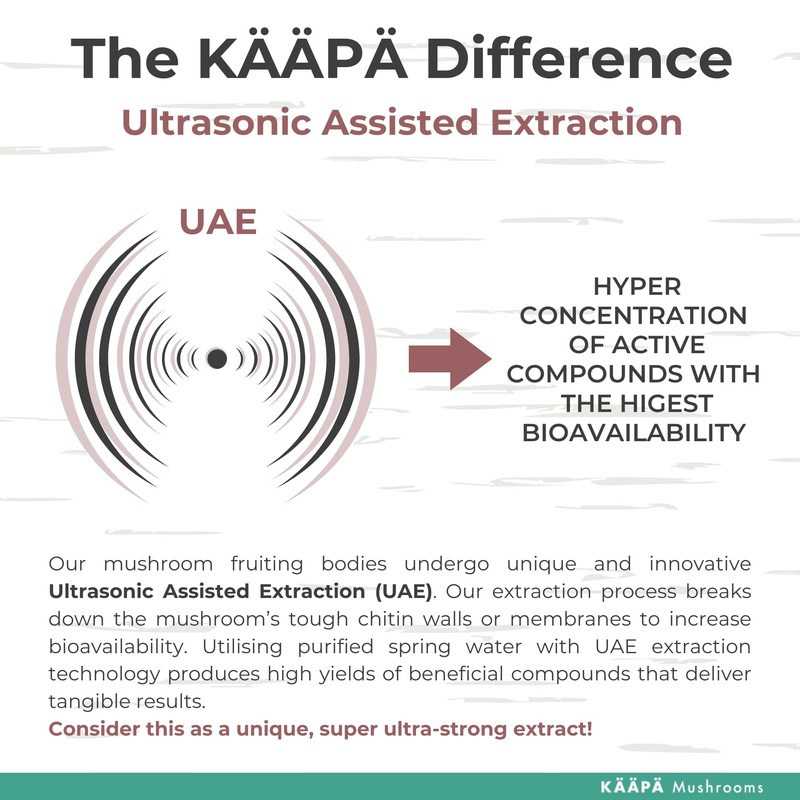 - GOLD STANDARD ULTRASONIC EXTRACTION: To extract high yields of bioavailable compounds from our potent Reishi mushrooms, we use purified spring water alongside Ultrasonic Assisted Extraction technology. This method breaks down the Reishi mushroom tough cell walls far more efficiently, ensuring maximum bioavailability of vital compounds like triterpenes and beta-glucans.