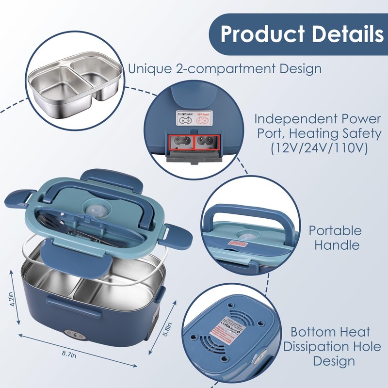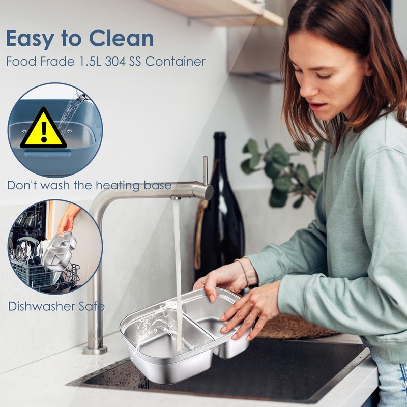 - ✅[2 Compartments Design & Food Grade Material] - The newest 2 compartments design can hold different kinds of food and prevent taste mixing, perfect for stews and soups. The removable 1.5L 304 stainless steel container ensures easy cleaning and is safe for food storage (dishwasher safe). Extra 0.45 L plastic box can store your veggies, salad, fruits, and much more. (Tips: Please do not wash external heating lunch box with water, and don't add water to the heating base.)