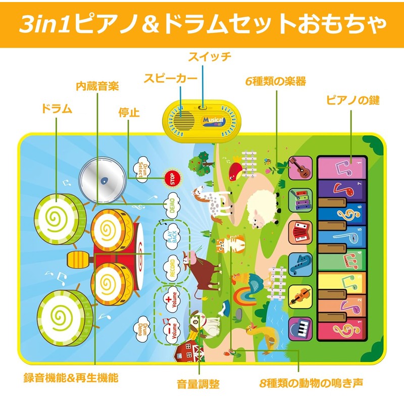 - 3-in-1 Piano and Drum Set Toy: This piano mat features 6 different instruments (piano, violin, electric vibraphone, trumpet, accordion, guitar) on the piano side.The drum set side has a drum instrument and 8 drum demos. 2 mallets for hitting the drum are also included.The toy enables children to play music in a variety of genres.Children can have fun learning and making music.This toy is sure to delight when given to a child on their birthday, Christmas, or any other special occasion.