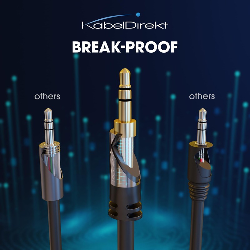 - Developed in Germany: The Aux cable from KabelDirekt is machine tested and recognised worldwide by millions of customers for its reliability. The soldered joints of the gold-plated plugs are protected by a break-proof metal sleeve