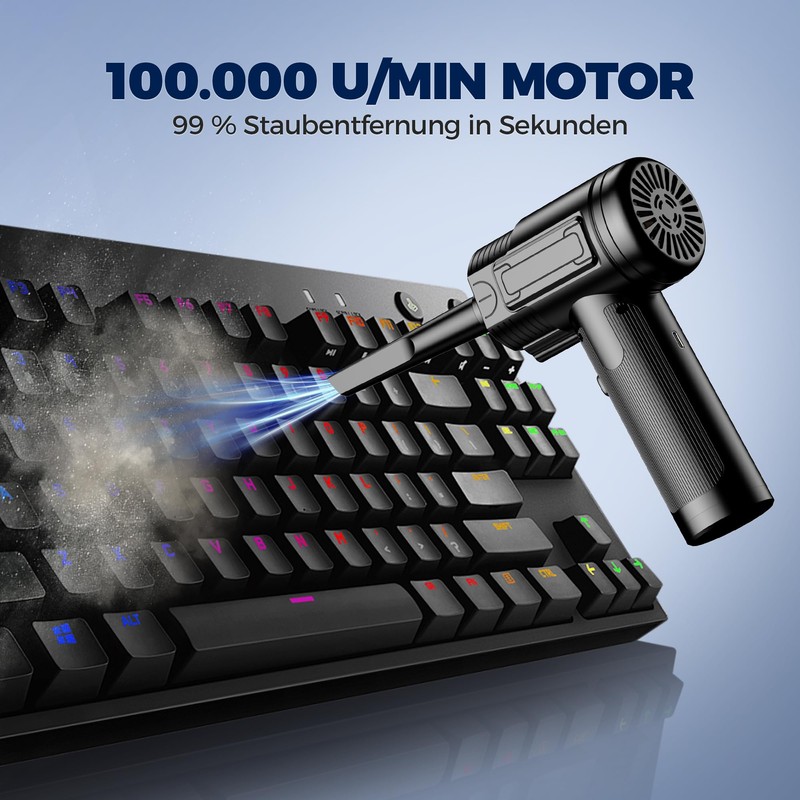 - PROFESSIONELLE REINIGUNGSKRAFT: Der RADCLO elektrische Staubgebläse Akku bietet 3 einstellbare Stufen bis zu 100.000 U/min Druck für gründliche Reinigung von PC-Innereien, Autoelektronik, Tastaturen und schwer zugänglichen Ecken. Er entfernt selbst hartnäckigen Staub ohne Chemikalien – die perfekte Alternative zu herkömmlichen Air Duster-Sprays! INTEGRIERTE LED-BELEUCHTUNG & 3-STUFEN-REGELUNG Die praktische LED-Leuchte erhellt dunkle PC-Gehäuse oder Motorräume. Einfache Bedienung: 3 Sekunden Power-Taste für Ein/Aus, kurzer Druck zum Wechseln zwischen 50000/75000/100000U/min – präzise angepasst an Auto-Elektronik, Modelle oder sensible Oberflächen!