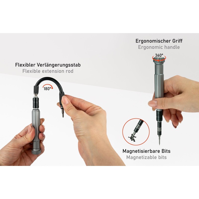 - Sophisticated details: built-in magnetizer & demagnetizer, extendable bit holder, flexible extension rod