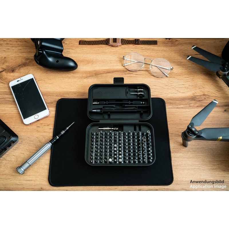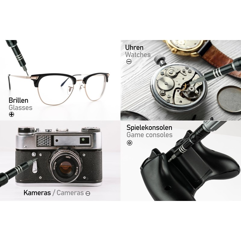 Our high quality precision mechanic tool kit provides you with everything you need for repairs, adjustments and crafts. Whether repairing your smartphone, iPhone, iPad, Macbook, tablet, game console or changing the batteries in your watch or camera, adjusting your glasses or installing computer accessories, with the Kabelmeister Precision Screwdriver Set you always have the right tool at hand.