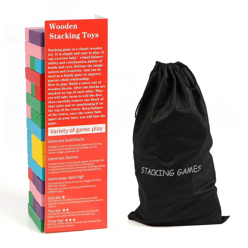 KABENFIS Wooden Building Blocks Colourful Tower Game with Storage Bag for Children Boys and Girls