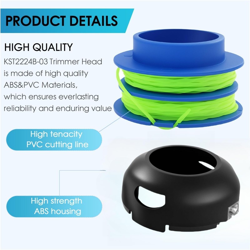 - KST2024A-03 Replacement trimmer head shell is made of ABS material and line is made of high quality nylon material to maximize cutting efficiency and durability,providing long-lasting service for all your trimming needs