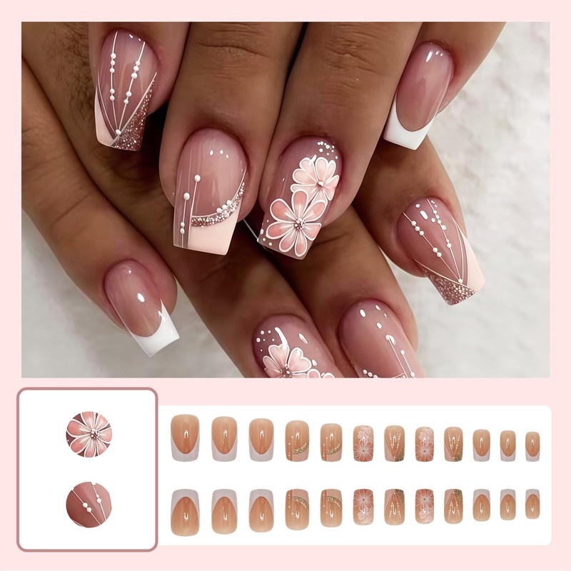 - Vielseitiges Set: Enthält 24 kunstvoll gestaltete Kunstnägel mit sommerlichen Blumenmotiven und klassischem weißen French-Design