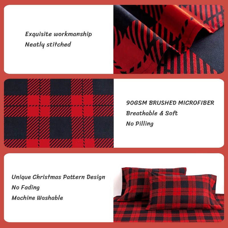 - 【Premium Quality Workmanship】: Our Red Black Plaid bedsheets Sets for full size bed uses 90GSM microfiber and super soft warm double brushed luxury fabrics. Environmentally friendly, realistic printing process.① Cotton-like soft feeling and breathable; ②Fade, shrink, and wrinkle resistant; ③ Thicker and more durable than cotton, with the strong stitching to prevent tears and have a longer service life.
