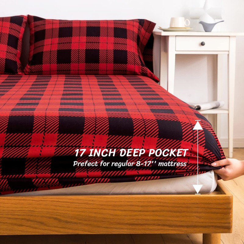KACEMOO Full Size Bed Sheets Set 4PC - Red Black Plaid Printed Sheet Soft Cooling 1800 Thread Count Brushed, 8-17'' Deep Pocket Kids Bed Sheet Set, Machine Washable Patterned Double Bedding Set