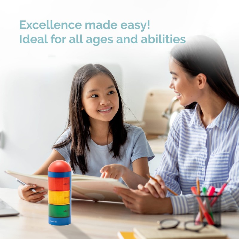 - Gamified Concept: The stoplight alarm with red, yellow, and green lights indicate let’s go, nearly there, and stop. The clock is easy to operate and requires only setting the alarm volume, time, and pressing the start button to begin the countdown