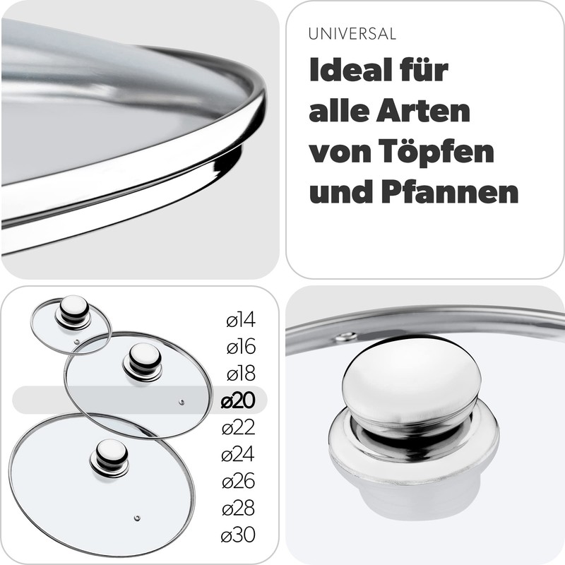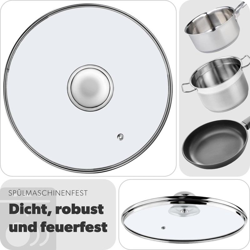 Kadax Glass Lid with Steel Handle, Heat-Resistant Lid for Pot, Lid with Steam Vent, Universal Lid in Various Sizes, Lightweight Pot Lid, Dishwasher Safe