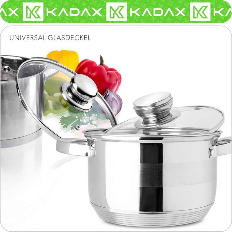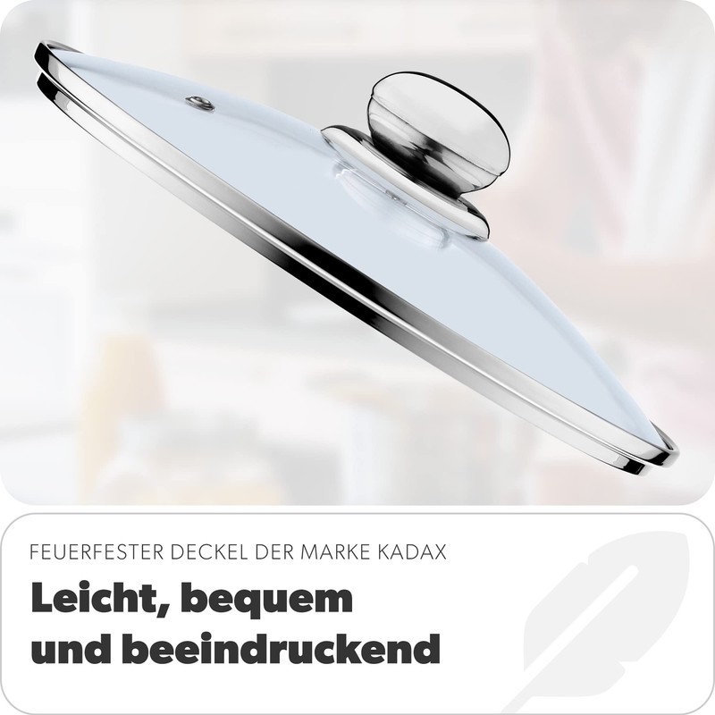 - Our fireproof lid from the Kadax brand is lightweight, comfortable and impressive. It also features a comfortable, ergonomic steel handle, a steam vent and a robust, thick glass structure. To meet the needs of our discerning customers, we have taken care of every detail. The task is simple: Close the pot or pan tightly to preserve the taste and aroma of the food. And of course all nutritional value!