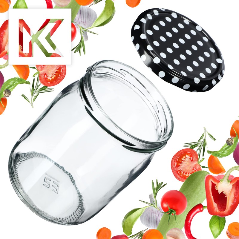 KADAX Jam Jars 540 ml, Preserving Jars with Screw Lids, Jars with Screw Cap, Preserving Jars, Storage Jars for Pickling Cucumbers (24 Pieces, Black Polka Dots)