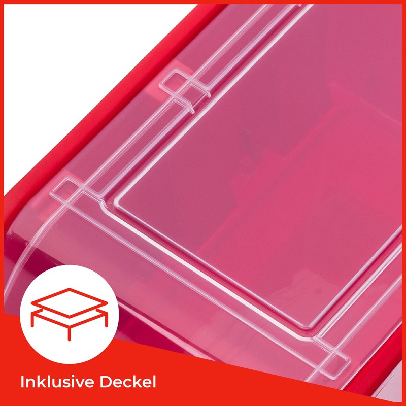 - Robust: the stacking box is made of a particularly robust plastic (PP). It is equipped with a clear lid that protects the contents from dust, dirt and spills during transport.