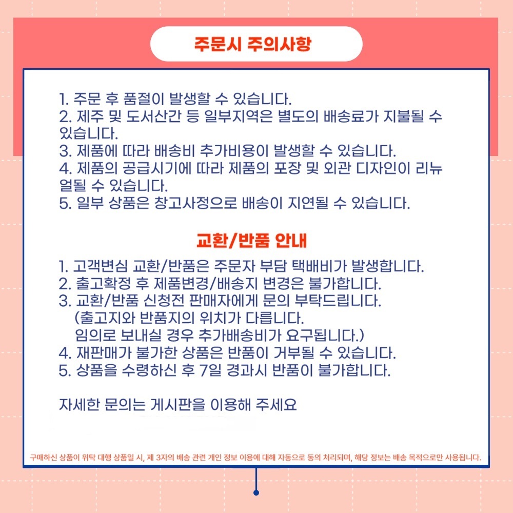 본 제품을 구매하시면 원활한 배송을 위해 꼭 필요한 고객님의 개인정보를 (성함, 주소, 전화번호 등) 택배사 및 제 3업체에서 이용하는 것에 동의하시는 것으로 간주됩니다.
