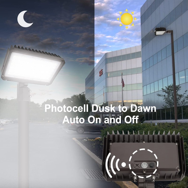 - Photocell Auto On and Off – Thanks to the photo cell technology, this LED parking lot light automatically turns itself on at dusk and off at dawn. Besides, you can easily disable the photo cell if you prefer to control light with your own switch.