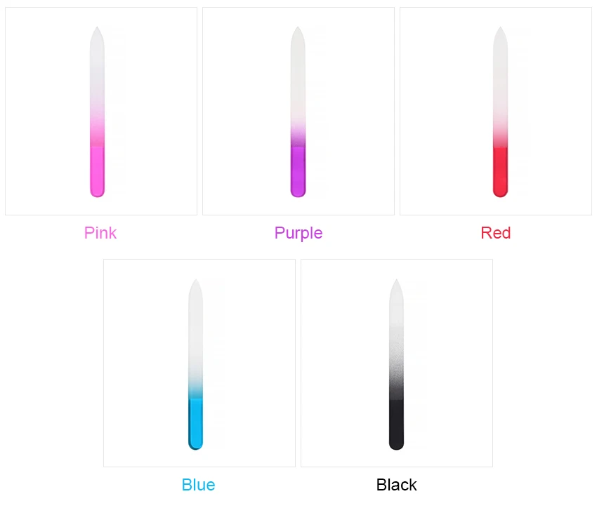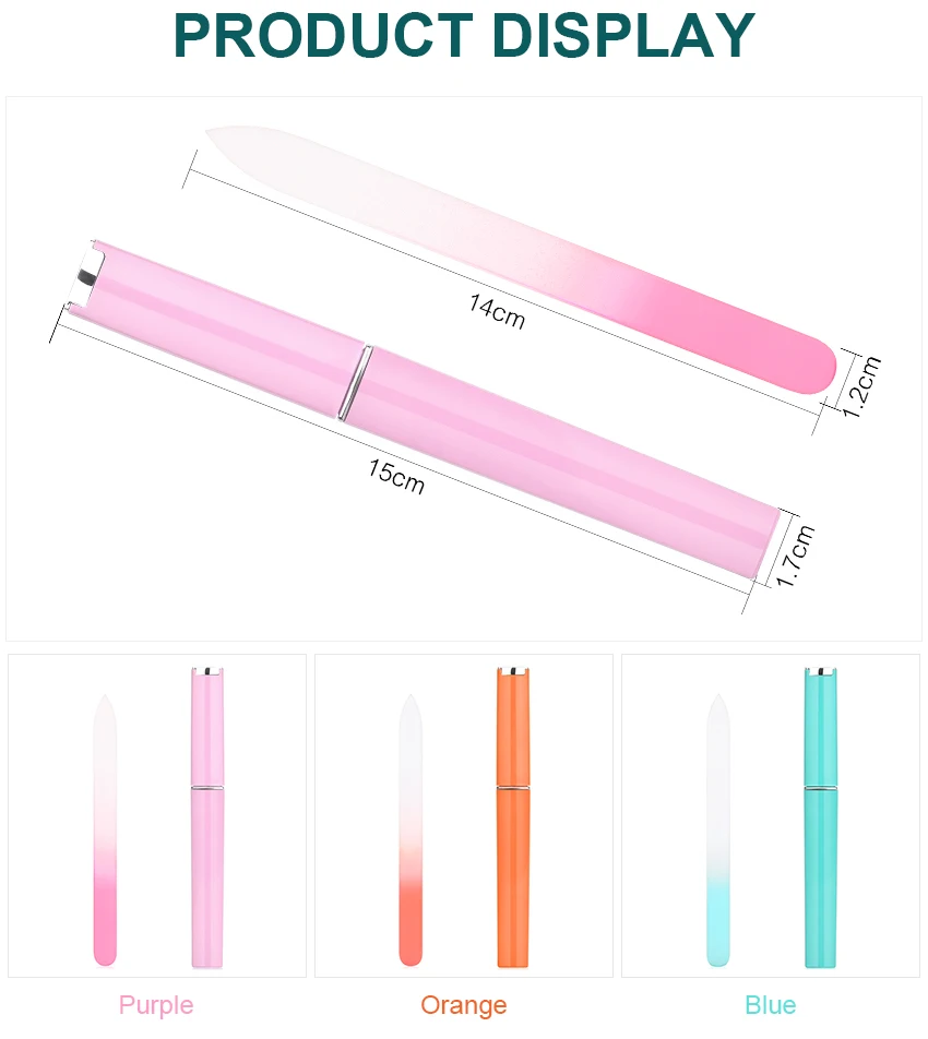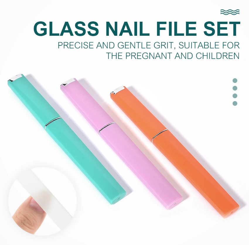 Glass Nail File,Glass Nail Filing,Glass Nail File,Glass Nail Files Manicure,Nail File Glass,Nail File Glass Material:Glass Color:Orange,Pink,Blue Fine grit:Precise and gentle grit,suitable for the pregnant and chilidren. Safe design:User friendly with the round end,avoid any injury. Easy to clean:Wash it directly by running water after each use. File the nail surface ,remove nail gel. Thick but light-weighted:3mm in thickness,with a great grip. Special Pointed End:Clean the nail edges with the pointed end. Package: 3Pcs file glass nail
