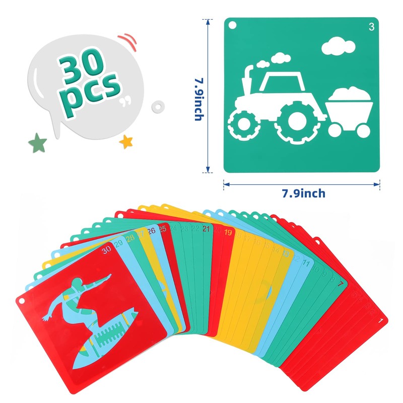 - 【Kids Drawing Stencils】A set of 30 children's stencils . Plastic stencil size 7.87*7.87inches .All the patterns can be mixed and matched at will. These will enhance children's imagination and creativity.