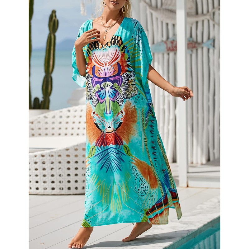 - Kaftan Swim Cover Up: This caftan dress for women is made of 100% viscose, making it skin-friendly and soft. Its lightweight design keeps you cool and refreshed during the summer