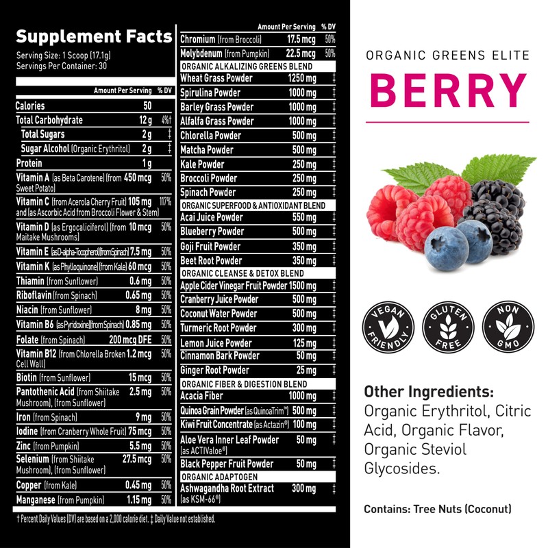 Kaged Organic Greens Elite Powder | Berry | Outlive 100 Superfood & Greens Powder | Apple Cider Vinegar, Adaptogen, Prebiotics | Vitamins & Minerals | Supplements for Men & Women | 30 Servings