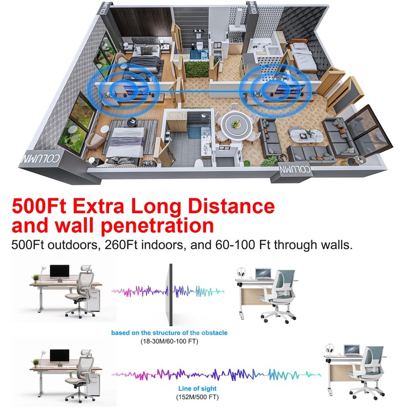 - Long Range Transmission: Enjoy a reliable connection with the wireless HDMI transmitter and receiver with a range of up to 500 feet outdoors, up to 250 feet indoors, and up to 100 feet through walls. Ideal for large rooms, meeting spaces, and classrooms